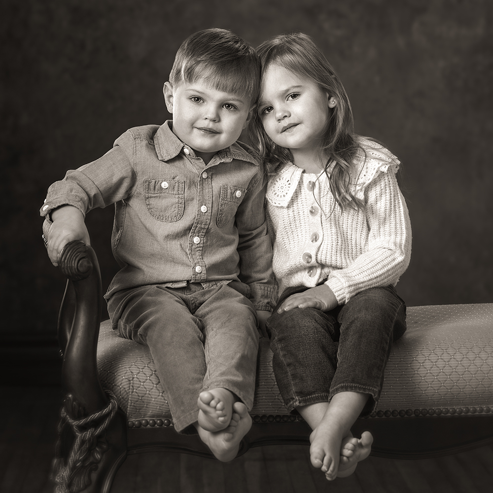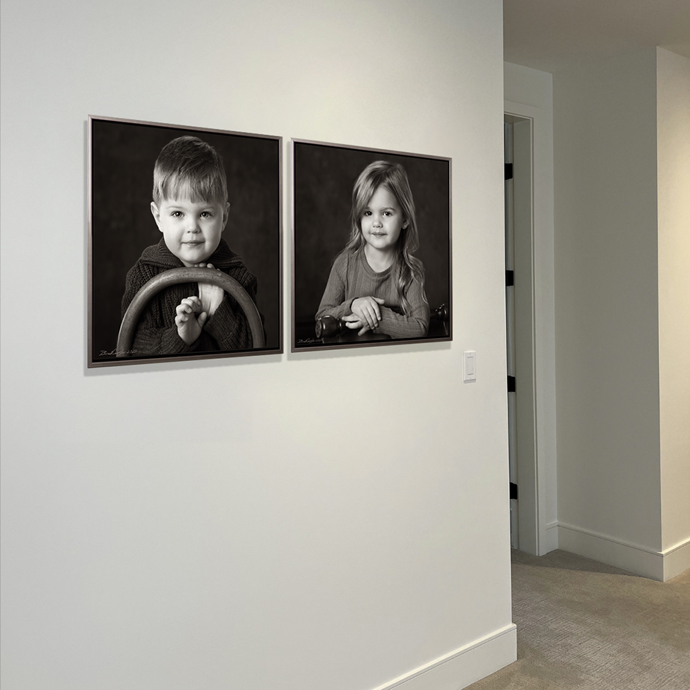 "Brad first photographed my family in 1993 and he captured my boy’s personalities on that chilly fall day while we waited for the golden hour to arrive. I am now the proud Lili, grandmother, of Charlee and Cooper who are about to be three. I’ll admit, I was a bit nervous that they might not cooperate or have an attention span that would allow an amazing experience. The uniqueness of the Gilded Bronze really showcased their personalities. I’ve never had much exposure to the bond that twins have but can see it in every photograph. Their ability to participate and do what Brad asked of them still amazes me. I’m thrilled to add this to my collection of family portraits."